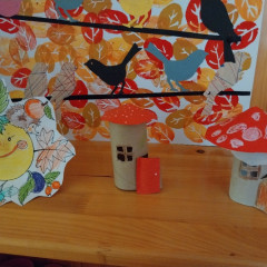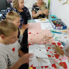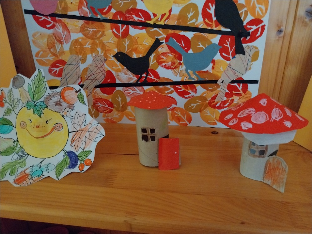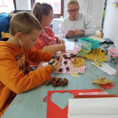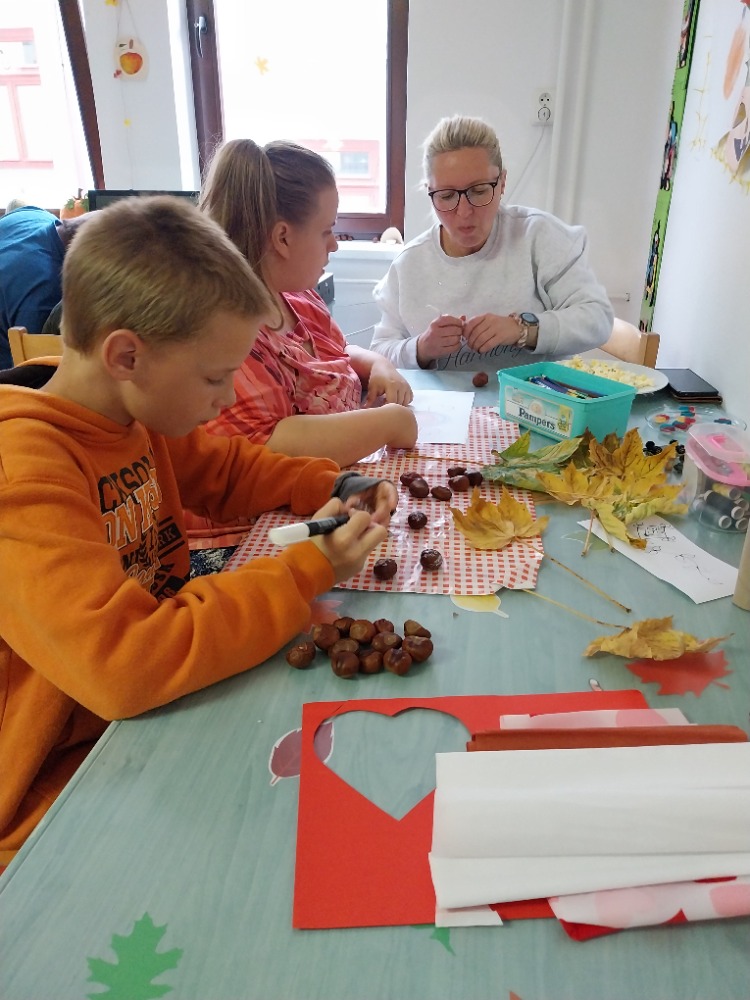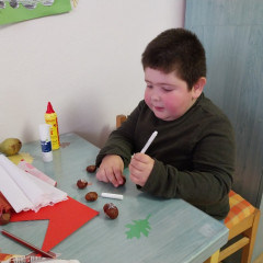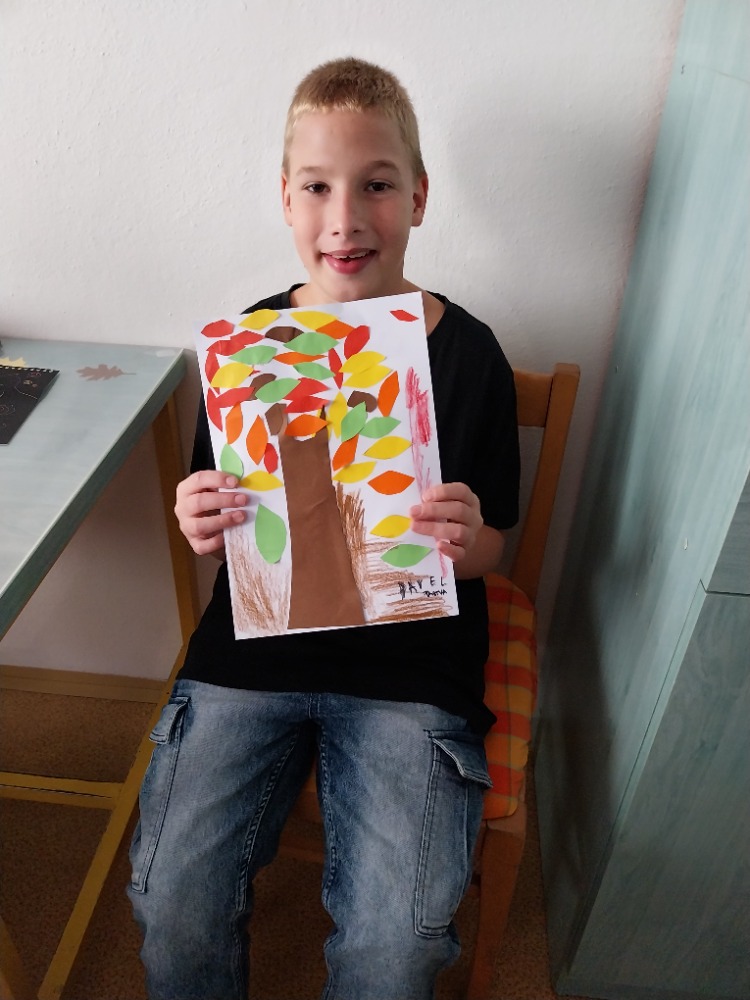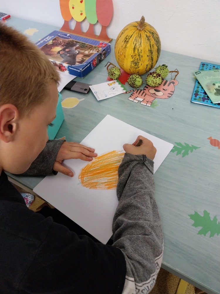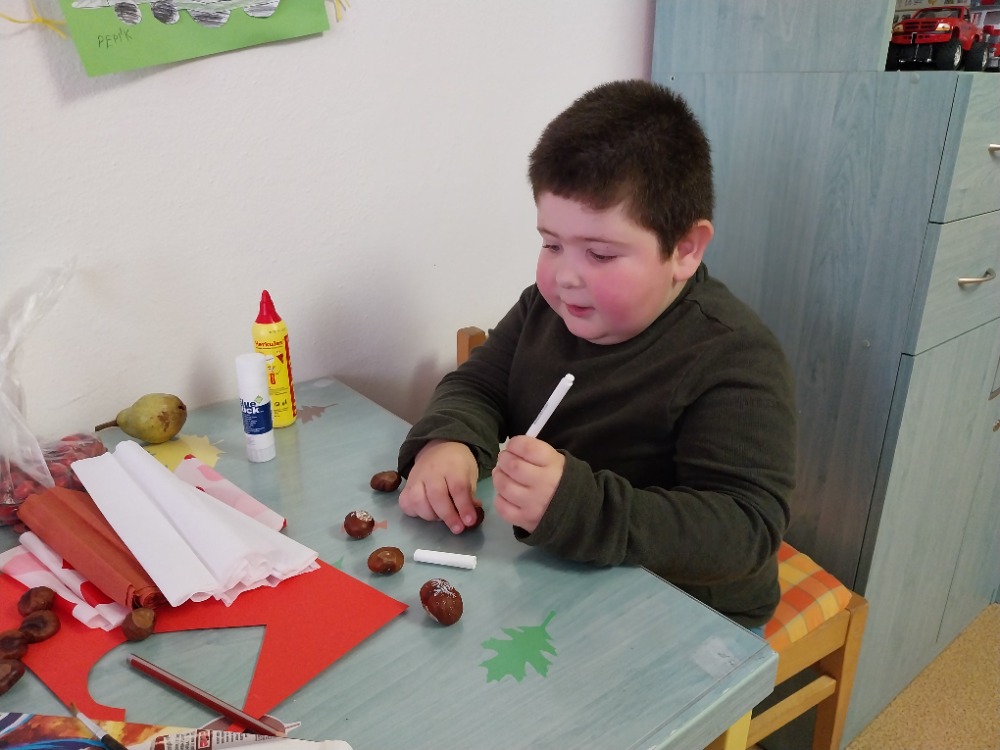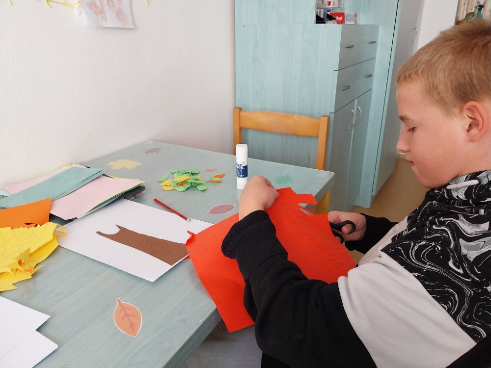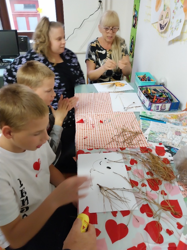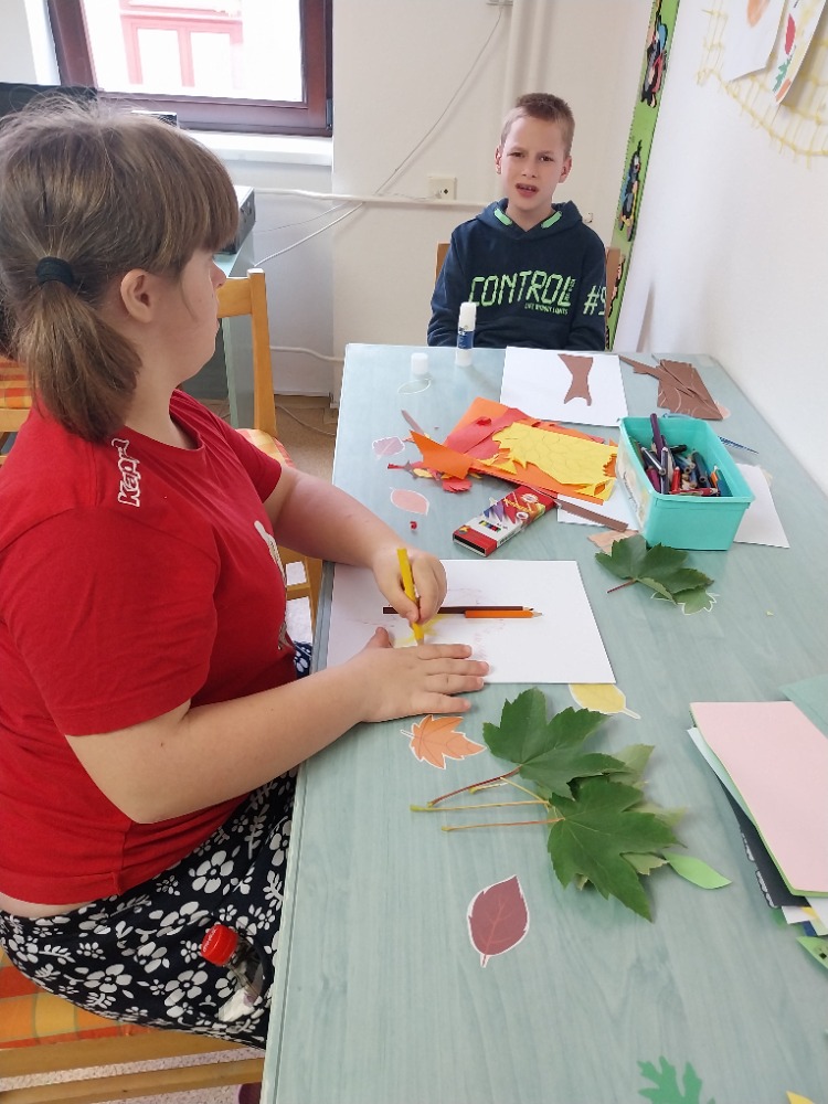 lepení, stříhání, malování, použití přírodnin a barevného papíru