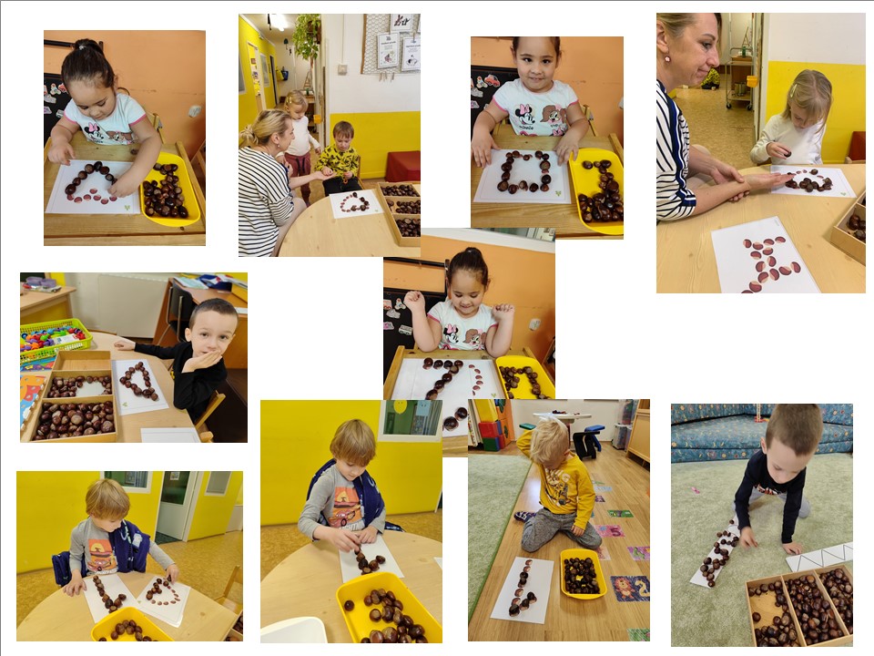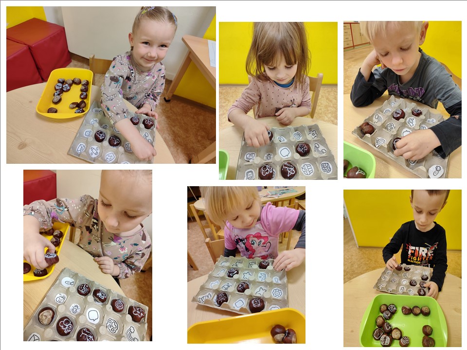 Kaštany jsme malovali, počítali, vkládali, skládali, cvičili s nimi, házeli je, učili jsme se o nich básničku.
