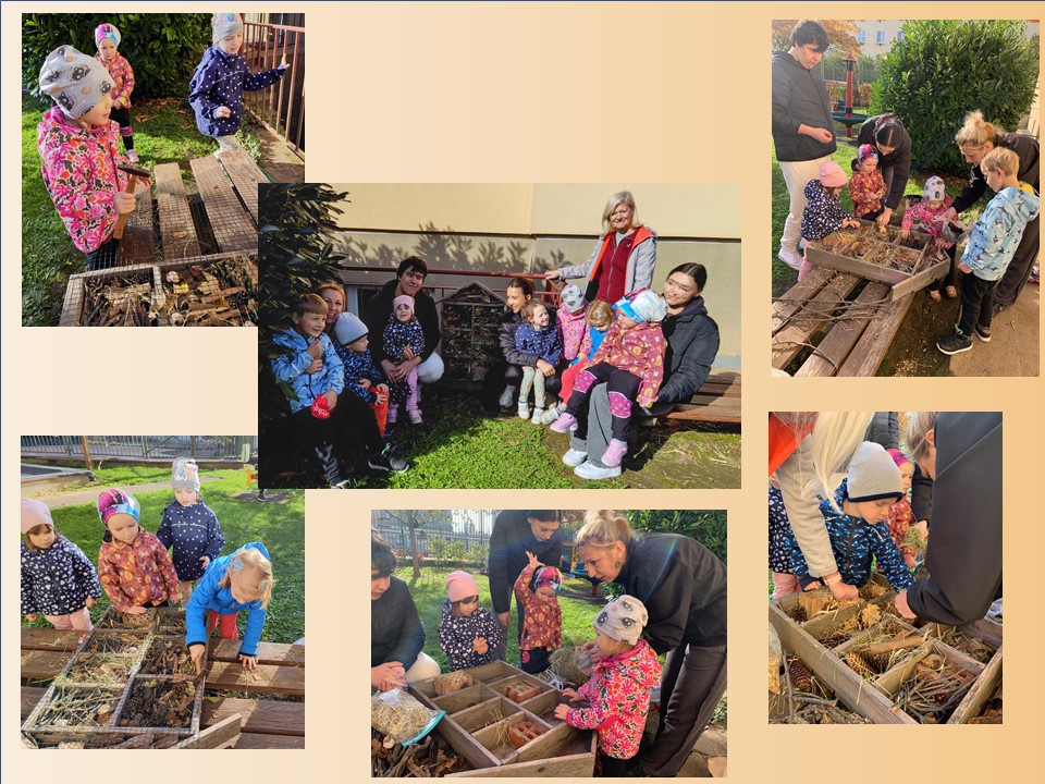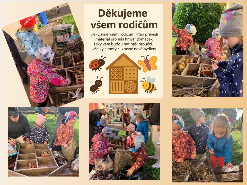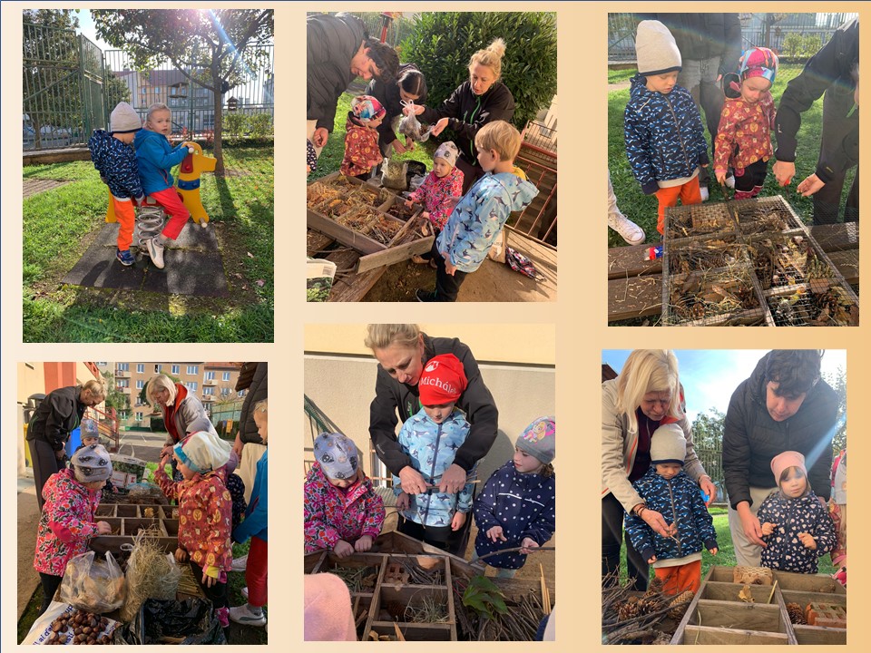 S velkou pomocí rodičů, kteří nám přinesli přírodniny, jsme dnes vytvořili domeček pro hmyz, který s námi žije na zahrádce. Děti nejen udělaly dobrý skutek, ale také poznávaly různé přírodniny a zatloukaly hřebíky.